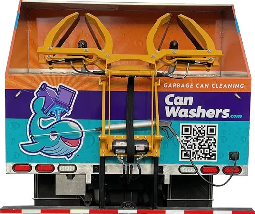 Our garbage can cleaning truck works fast, cleaning two cans simultaneously.